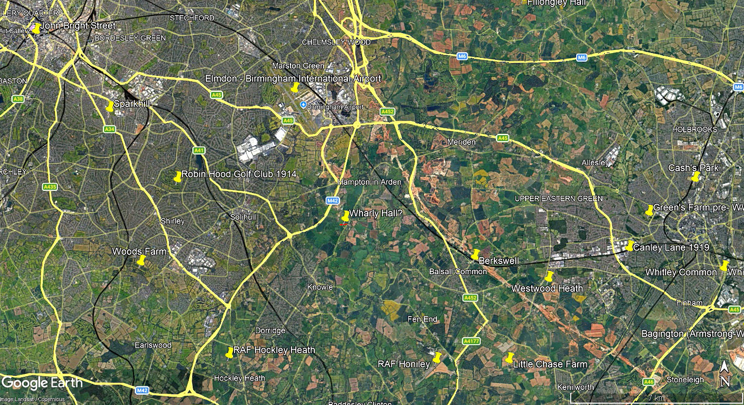 NOTES: We have Mr Graham Frost, a great friend of this 'Guide', to thank for pointing out this location in 2023. He discovered that the Auster J/1 Autocrat, G-AGVL, was registered to the address: Wharly Hall, Eastcote, Hampton-in-Arden. From 10.01.46 to 14.04.49, and the base for G-AGVL was given in the British Civil Register as Hampton-in Arden. Wharly Hall itself seems to have been demolished many years ago.